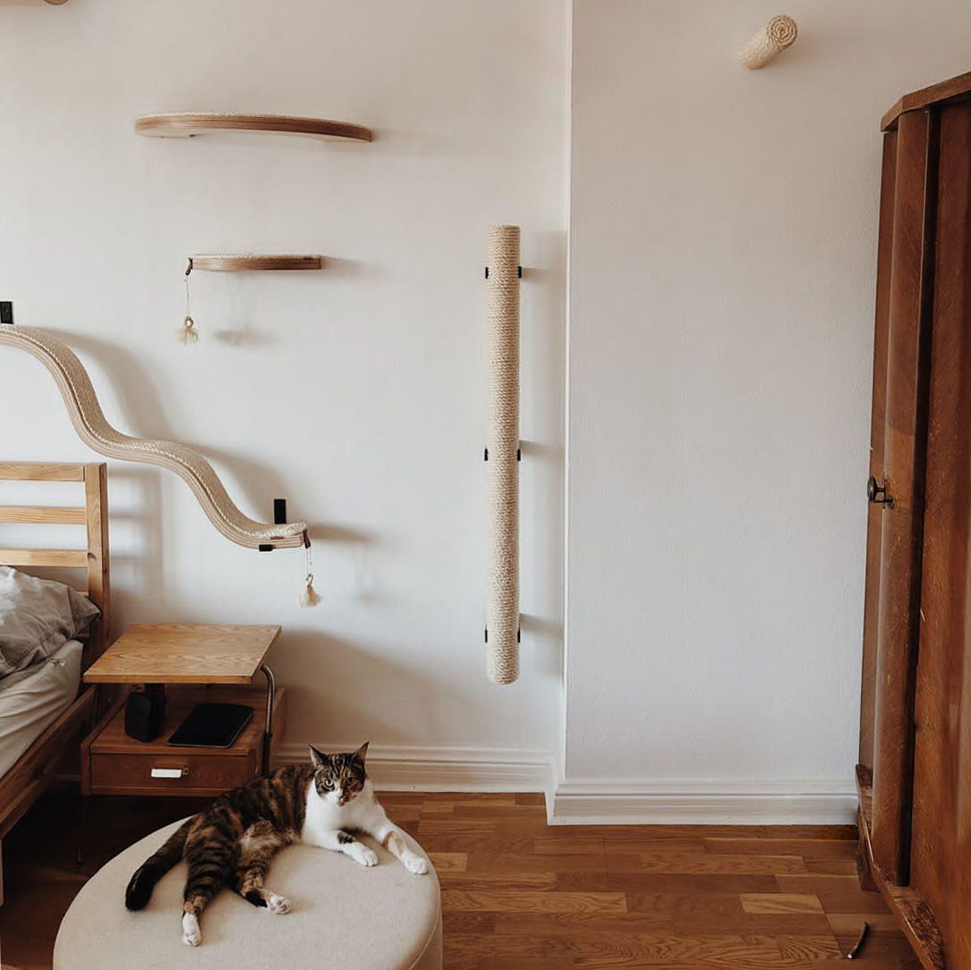 Drapak ścienny dla kota Gökotta możesz zamontować pod dowolnym kątem. Rura do drapania dla kota przytwierdzona do ściany pionowo posłuży Twojemu pupilowi jako klasyczny drapak. Z doświadczenia wiemy że koty z radością wdrapują się na nią i siadają na samym szczycie. Gökotta zamontowana pod skosem może pełnić rolę schodków dla kota. Możesz też ustawić ją poziomo tworząc most dla kota. Z kilku półek dla kota jesteś w stanie stworzyć wspaniały plac zabaw dla kota – ogranicza cię tylko wyobraźnia i kable w ścianie 😉 Drapak ścienny jest idealnym dodatkiem do półek do leżenia takich jak zestaw półek dla kota DUENDE oraz półki dla małych kotków HYGGE.