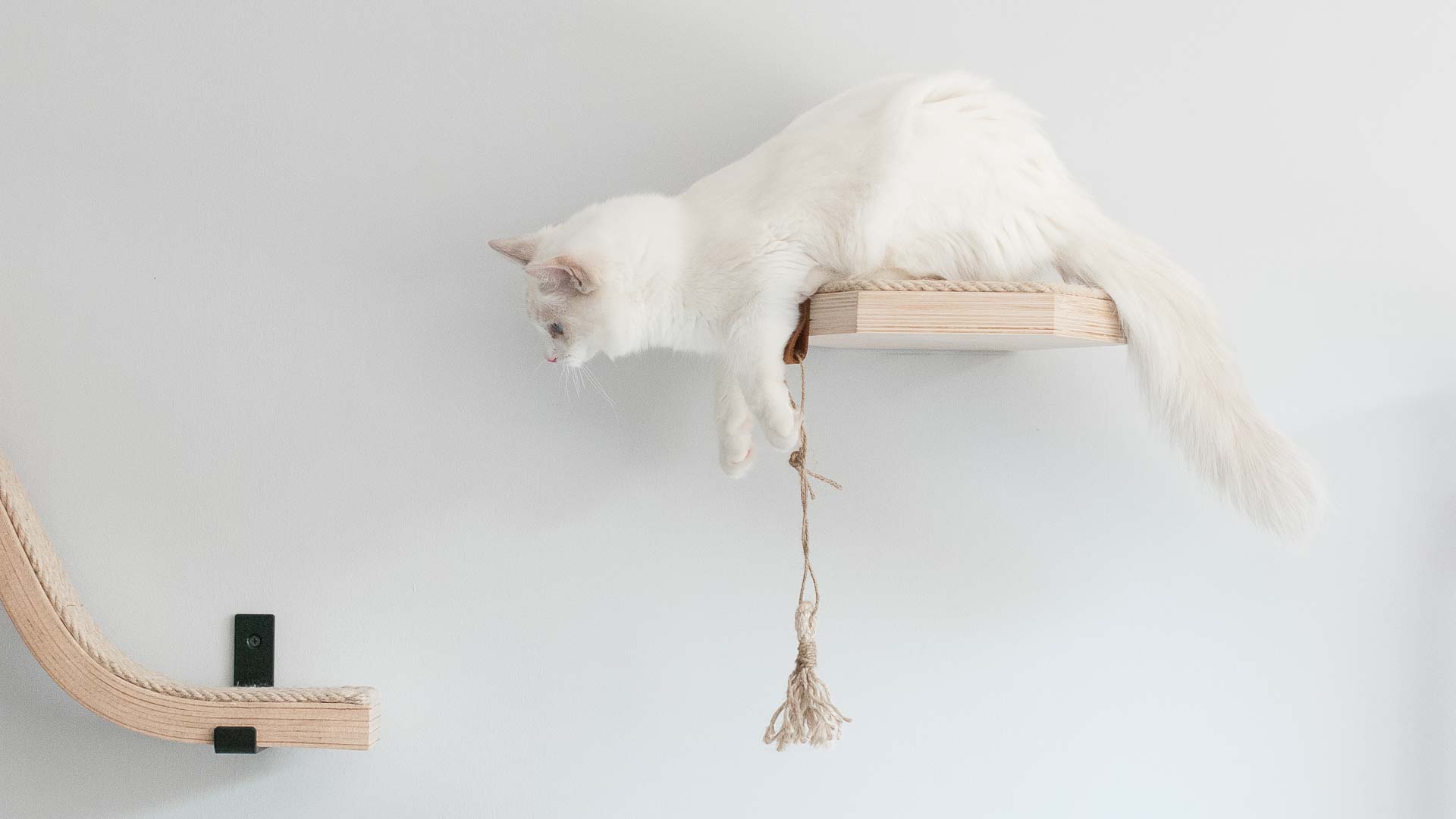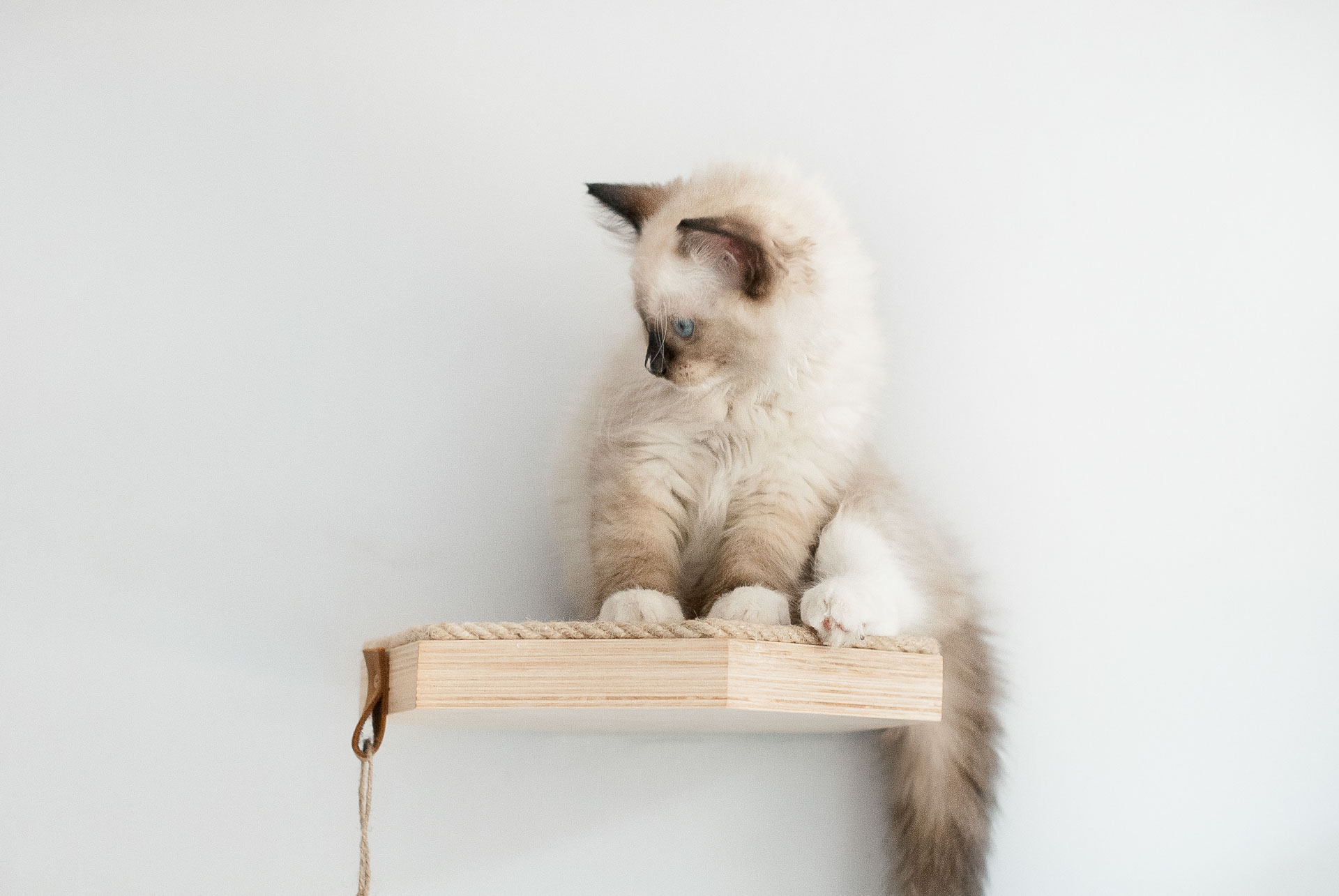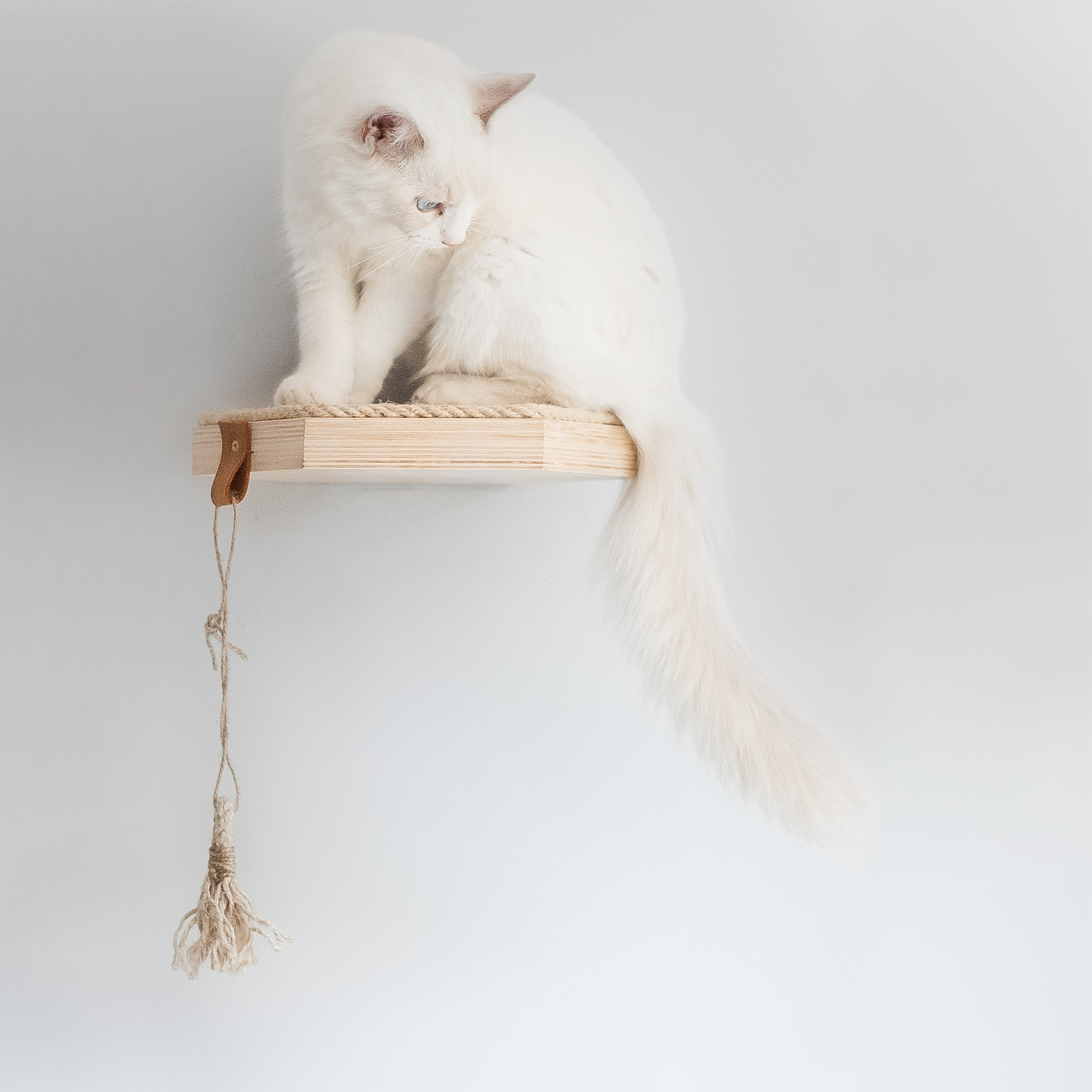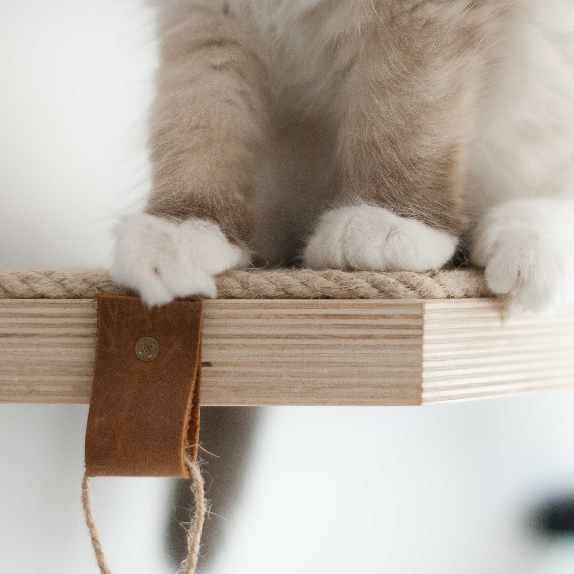 Dzięki pokryciu górnej powierzchni liną sizalową o grubości 8 mm półka staje się wyjątkowo bezpiecznym meblem dla kota. Półka jest antypoślizgowa, a w przypadku utraty równowagi kot z łatwością wróci na nią za pomocą pazurów.