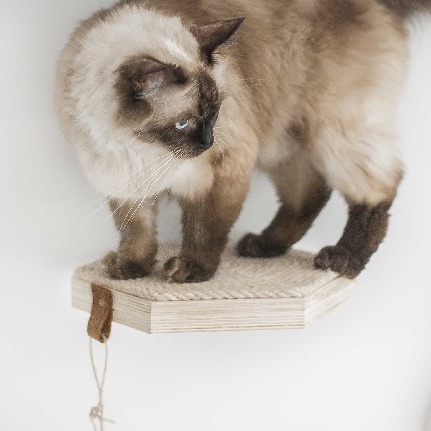 Ukryte mocowania sześciokątnej półki do ściany Hygge nie zaburzają estetyki wnętrza. Jednocześnie półki dla kota utrzymują ciężar nawet dużych kotów, takich jak Maine Coon czy kot brytyjski. Sześciokąty są wykonywane w całości ręcznie. Półki dla kotów Catelie są produkowane wyłącznie z naturalnych, ekologicznych materiałów. Sześciokątne półki nie przypominają standardowych mebli dla kotów, dlatego pasują do większości współczesnych wystrojów domów czy mieszkań.