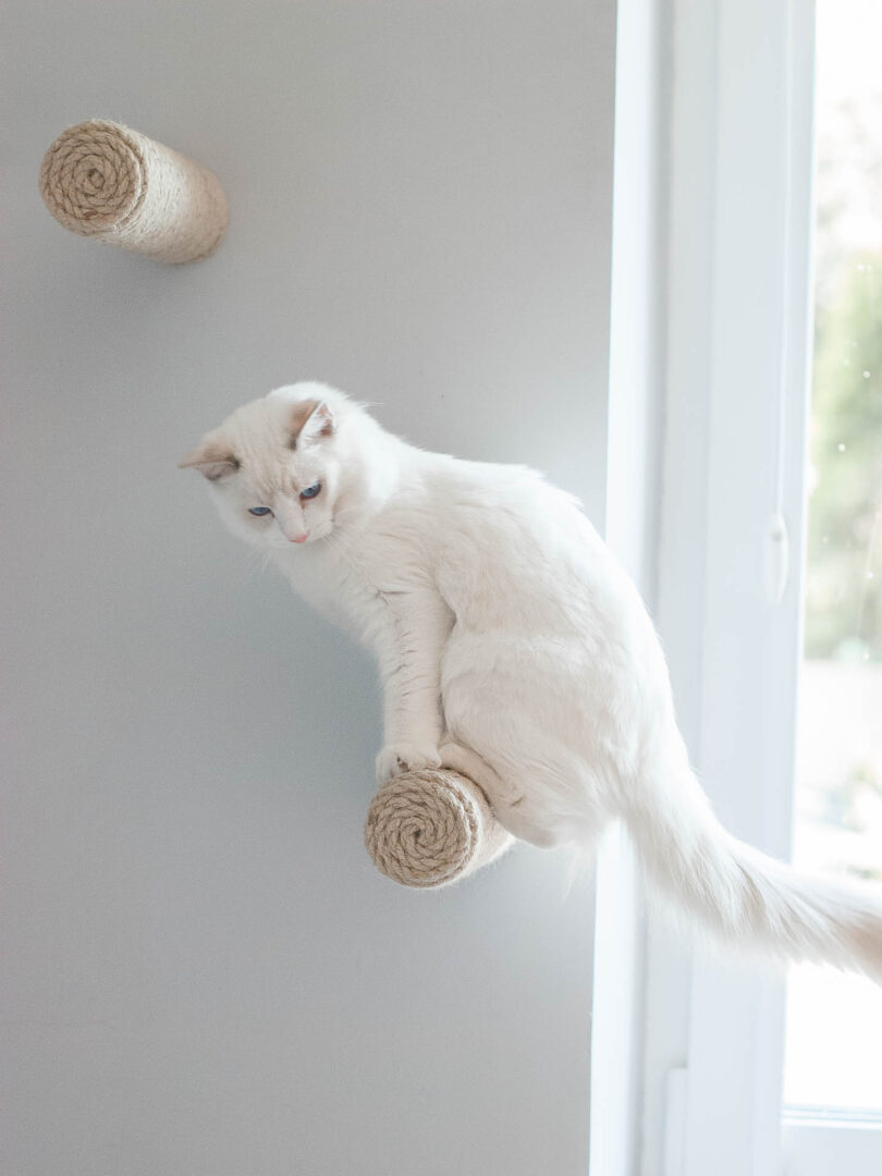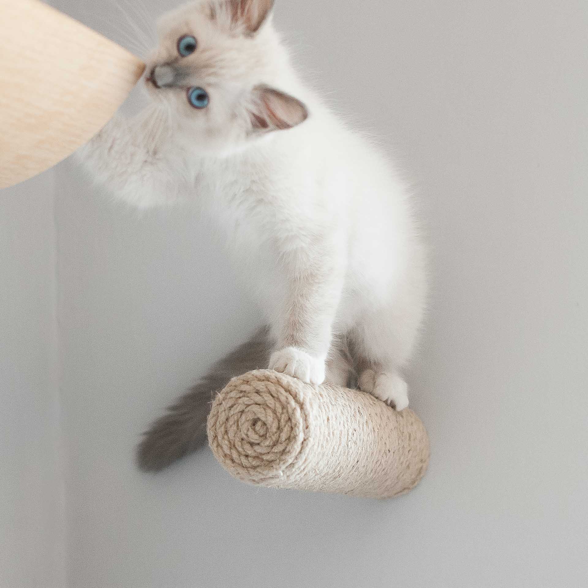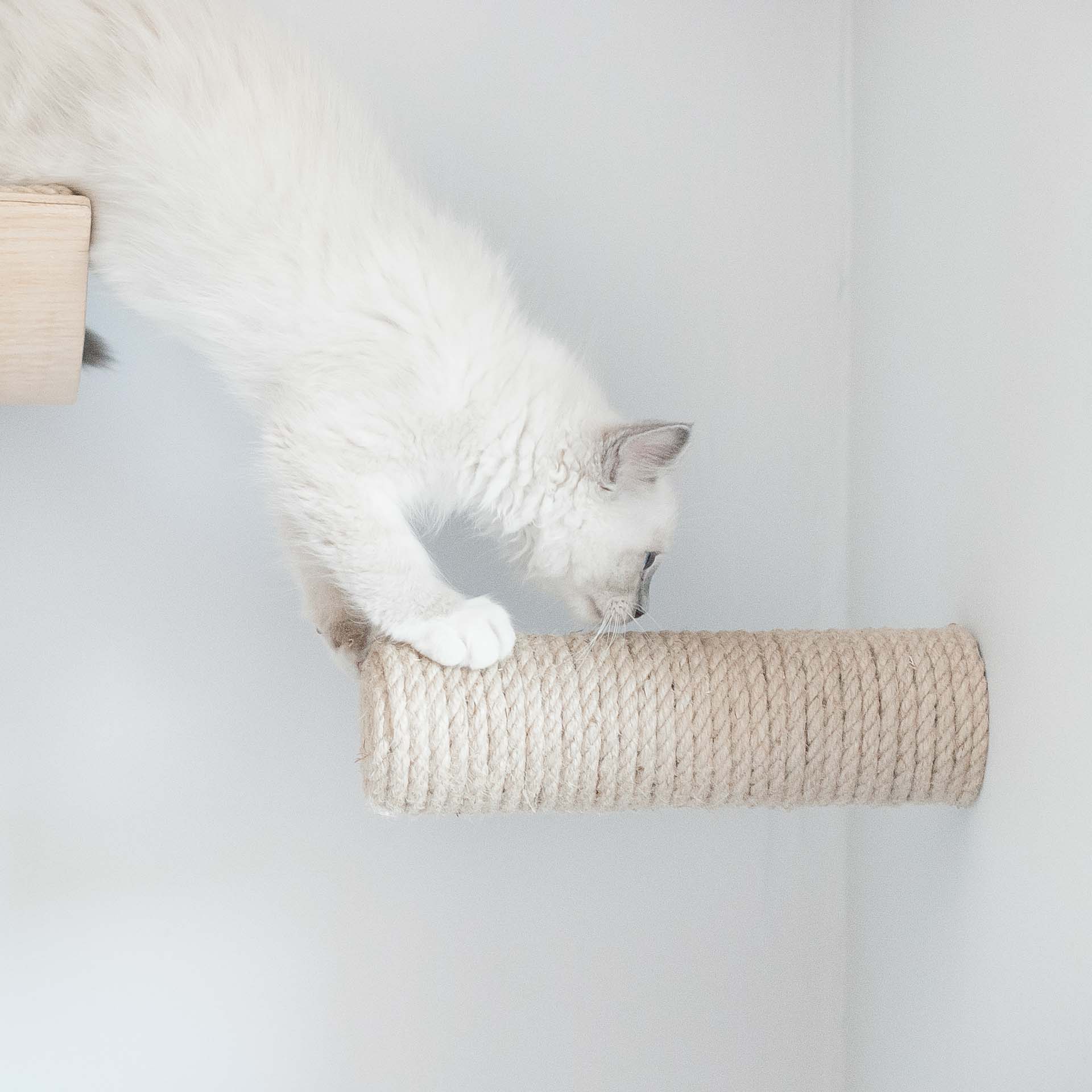 Sizalowe schodki to uniwersalny element kociej autostrady. Nawet jeżeli źle ocenisz odległość pomiędzy półkami i twój kot będzie miał kłopoty aby z nich korzystać – z pomocą przychodzi sizalowy schodek Kilig. Umieść go pomiędzy półkami i posłuży jako pojedynczy schodek dla kota. W połączeniu z półką LAGOM, która służy jako schodki dla kota w kierunku od lewej do prawej, schodek dla kota Kilig umieszczony nad półką dodaje dodatkowy kierunek wspinania się, czyli od prawej do lewej. Jeżeli brakuje ci wizji jak zagospodarować przestrzeń na ścianie, aby koty chętnie z niej korzystały – napisz do nas wiadomość, chętnie ci doradzimy.